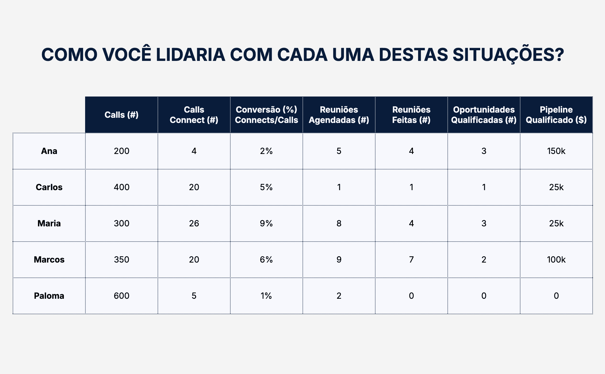 Olhe para os dados da Ana na tabela: 200 calls, apenas 4 connects (2% de conversão), mas 150k de pipeline qualificado. Enquanto isso, Carlos faz 400 calls, tem 20 connects (5% de conversão), mas apenas 25k de pipeline.